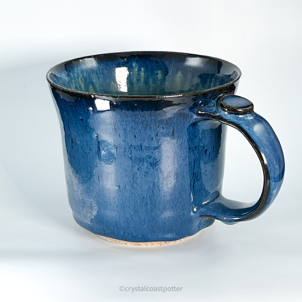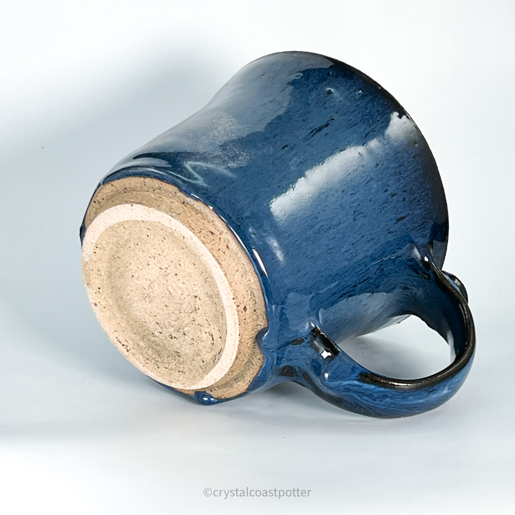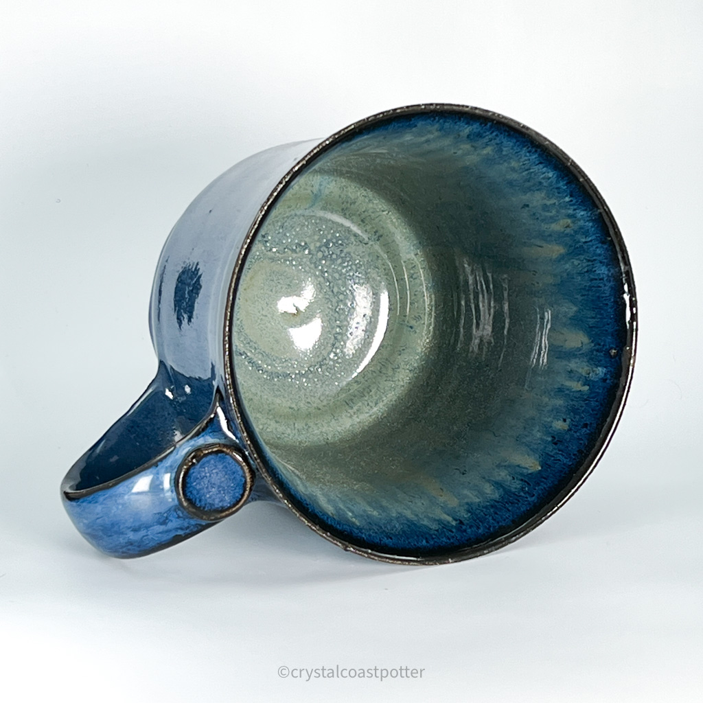 A one-of-a-kind big stoneware mug featuring a speckled brown clay body. Each piece is truly unique, highlighted by the teal flowing glaze that cascades down the sides, ensuring no two mugs share the exact same pattern.