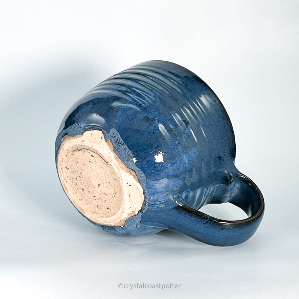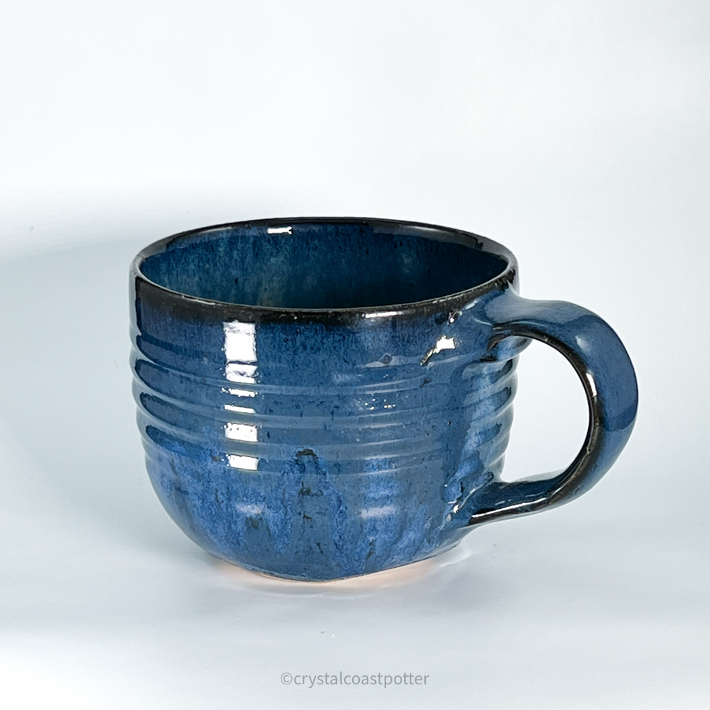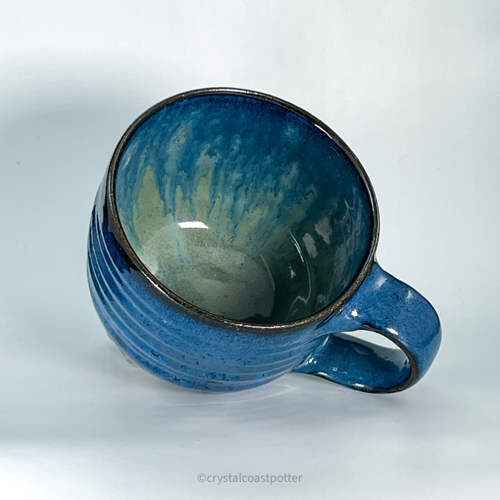 A one-of-a-kind stoneware mug featuring a speckled brown clay body. Each piece is truly unique, highlighted by the teal flowing glaze that cascades down the sides, ensuring no two mugs share the exact same pattern.