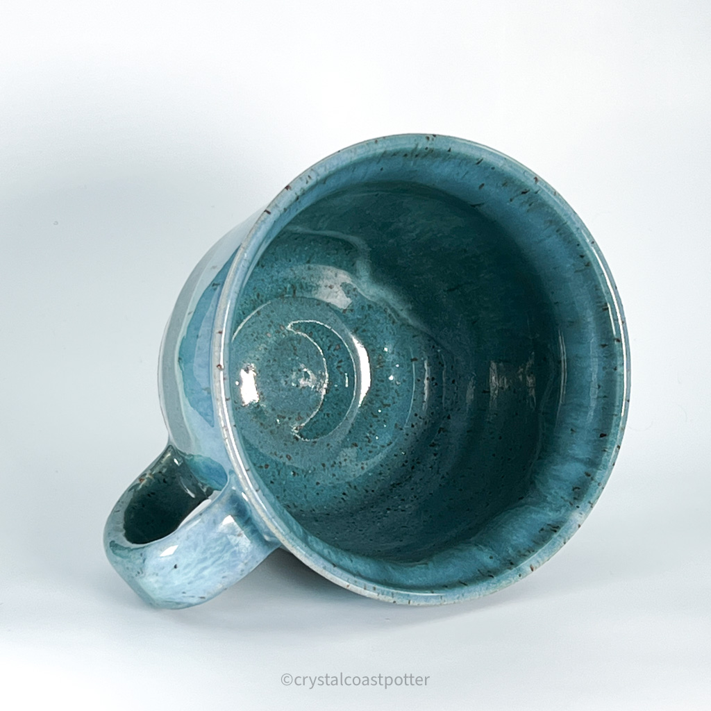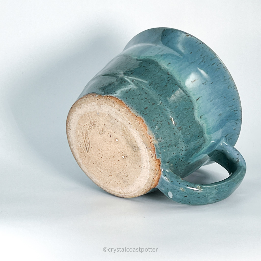 A one-of-a-kind stoneware mug featuring a brown stoneware clay body. Each piece is truly unique, highlighted by the teal flowing glaze that cascades down the sides, ensuring no two mugs share the exact same pattern.